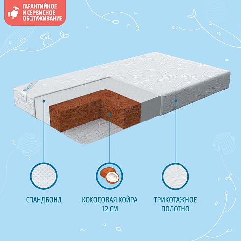 Детский матрас Nuovita Coco Doppio. Максимальная нагрузка на матрас 30 кг. Состав наполнителя: кокос 12 см + спанбонд. Жесткость матраса "выше среднего". Чехол матраса съёмный, выполнен из стеганного трикотажного полотна.