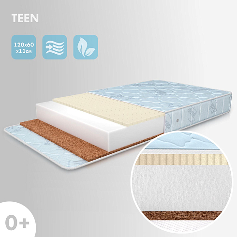 Детский матрас Nuovita Teen. Максимальная нагрузка на матрас 30 кг. Состав наполнителя: (ППУ) пенополиуретан  8 см + кокос 1 см + латекс 1 см. Жесткость матраса выбирается по сезонности либо по комфортности, одна сторона матраса обладает жесткостью "выше среднего", другая - "средней" (латекс). Чехол матраса съёмный, выполнен из хлопкового жаккарда.