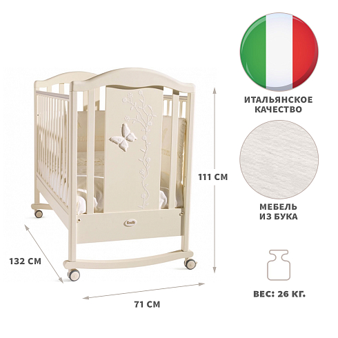 Детская кровать Feretti "PRIVILEGE Dondolo" красивая, с плавными линиями, изготовленная из ценных пород древесины, оснащена качественной фурнитурой, что говорит о ее безопасности и долгом сроке службы. У кроватки имеются колесики с фиксаторами, для более легкого перемещения изделия по помещения, даже в то время когда малыш спит, полозья для укачивания. Снабжена кроватка регулируемой по высоте стенкой, для более легкого доступа к ребенку. Ложе кровати  регулируется в 2 положениях, позволяя родителям подобрать наиболее подходящие в зависимости от возраста ребенка. Дно  спального места - реечное, для обеспечения правильной осанки у ребенка, а также для создания вентиляции и хорошего воздухообмена.