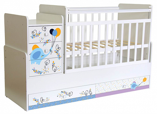 Кроватка детская Фея 1100 «Слоник на шаре» - с пеленальным комодом и механизмом качания. Кроватка-трансформер имеет приятную расцветку. Под кроваткой 2 выдвижных ящика, позволяющих удобно разместить вещи и игрушки малыша на небольшом пространстве. Кроватка-трансформер для новорожденных оснащена ортопедическим ложем, что очень важно для правильного развития малыша. Чтобы маме было удобно поднимать и класть в кроватку новорожденного ложе устанавливается в самое верхнее положение. Когда малыш научится переворачиваться и садиться ложе следует опустить в среднее положение. При этом мама сможет опустить бортик, если будет укладывать или поднимать малыша. Данная модель в отличие от кроватки-трансформера 1200 не имеет острых углов,  что делает ее абсолютно безопасной для ребенка.